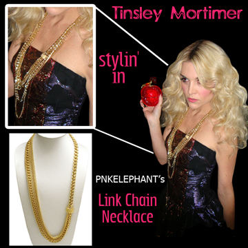 Socialite Tinsley Mortimer is rockin’ one of my favorite trends right now…the layered necklace! Without having to load on tons of different chains (although there is nothing wrong with that :)), this piece still allows you to make that haute fashion statement. Layer after layer this necklace is some serious neck candy!