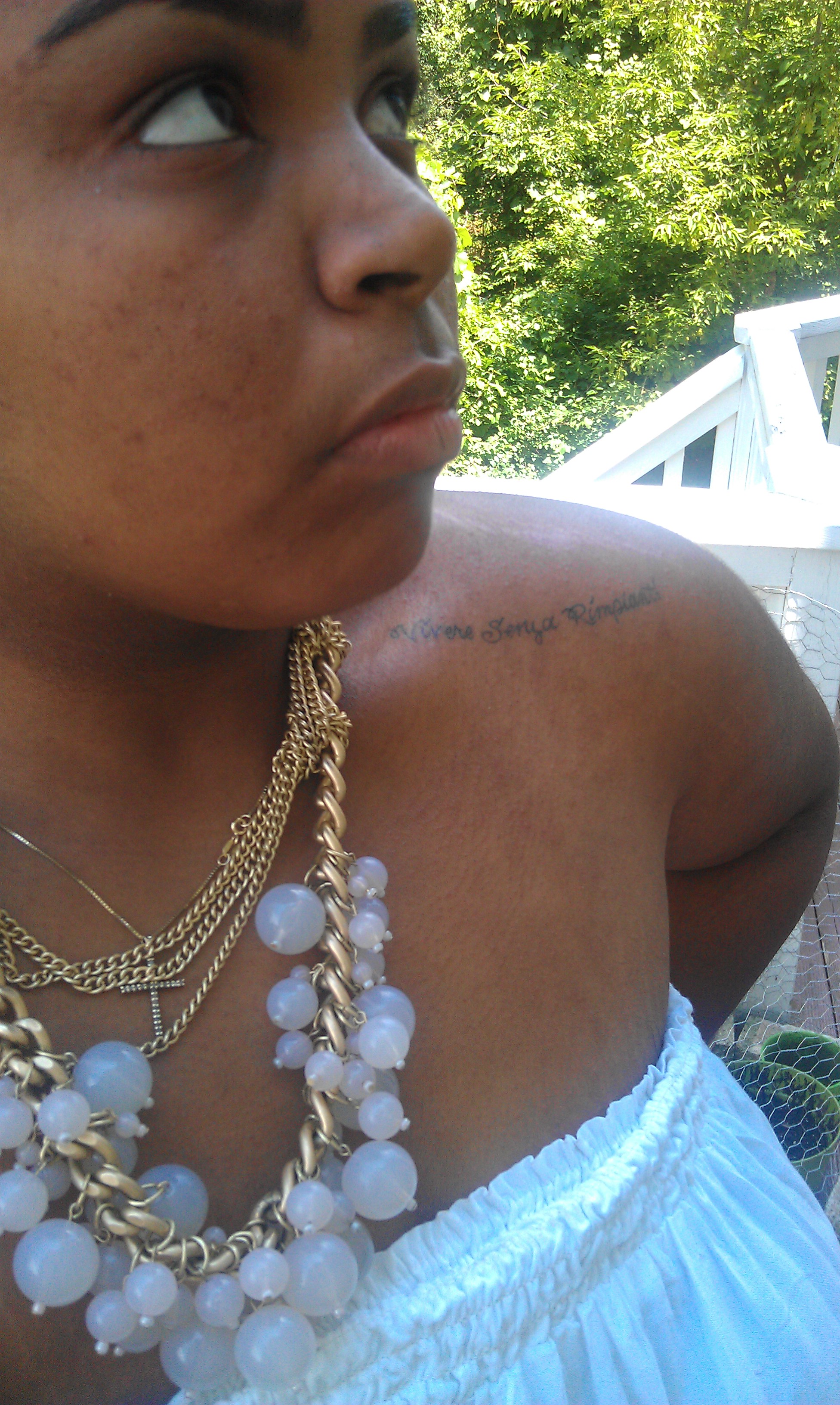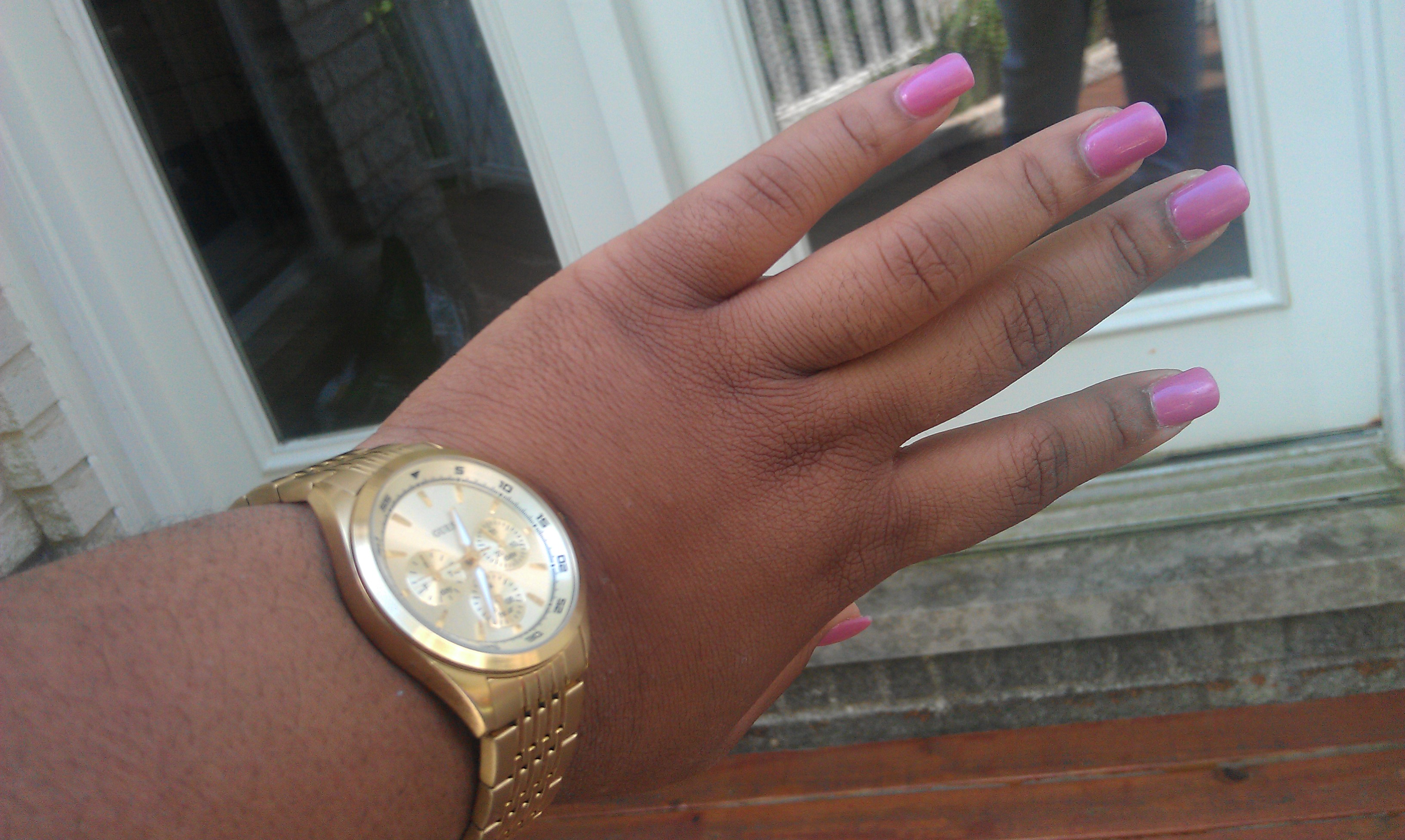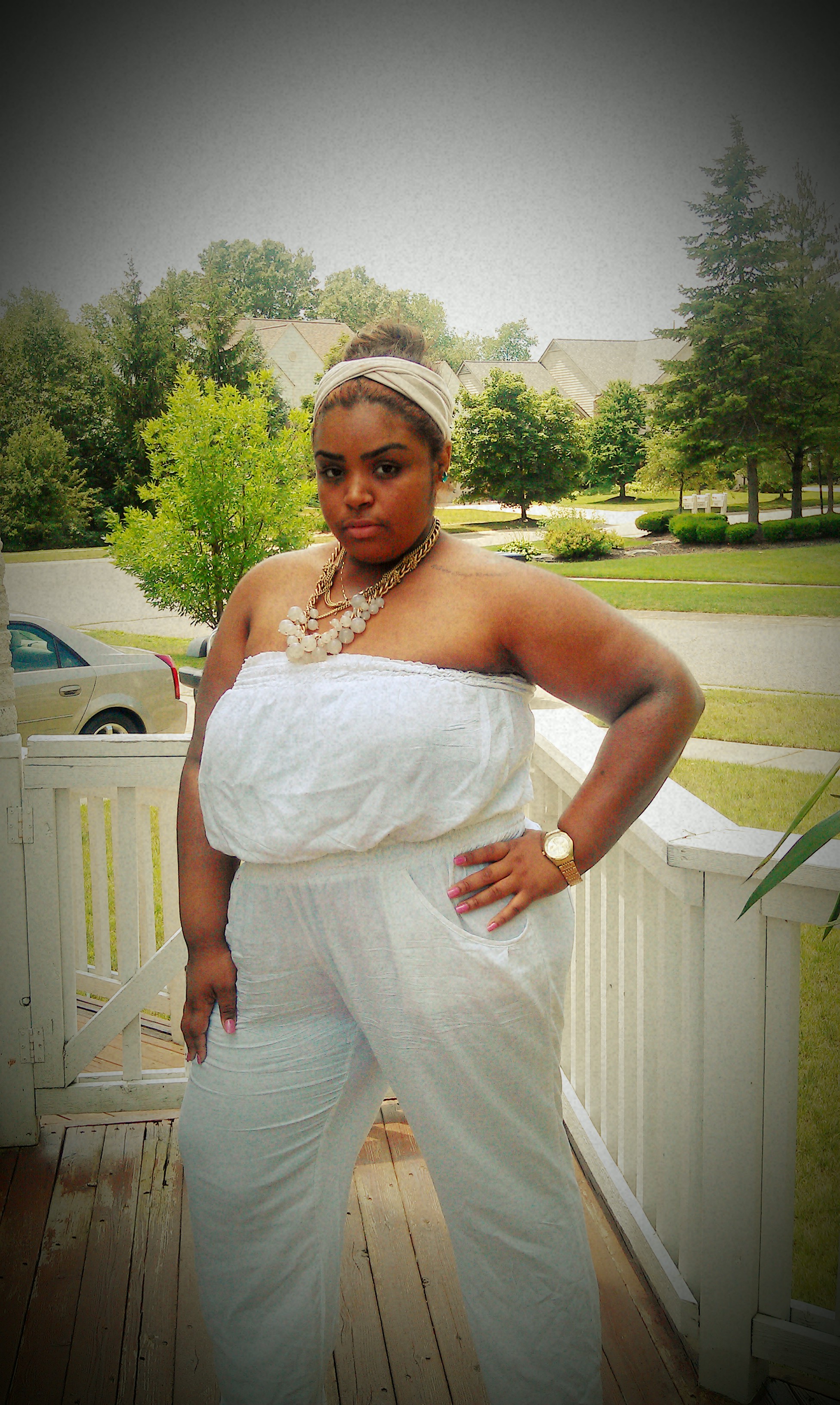 I’m wearing white romper from Simple Fashion $18, Guess gold plated watch $120, nude turban from nastygal.com $12, Macy’s gold chain and pink pearl necklace $30.