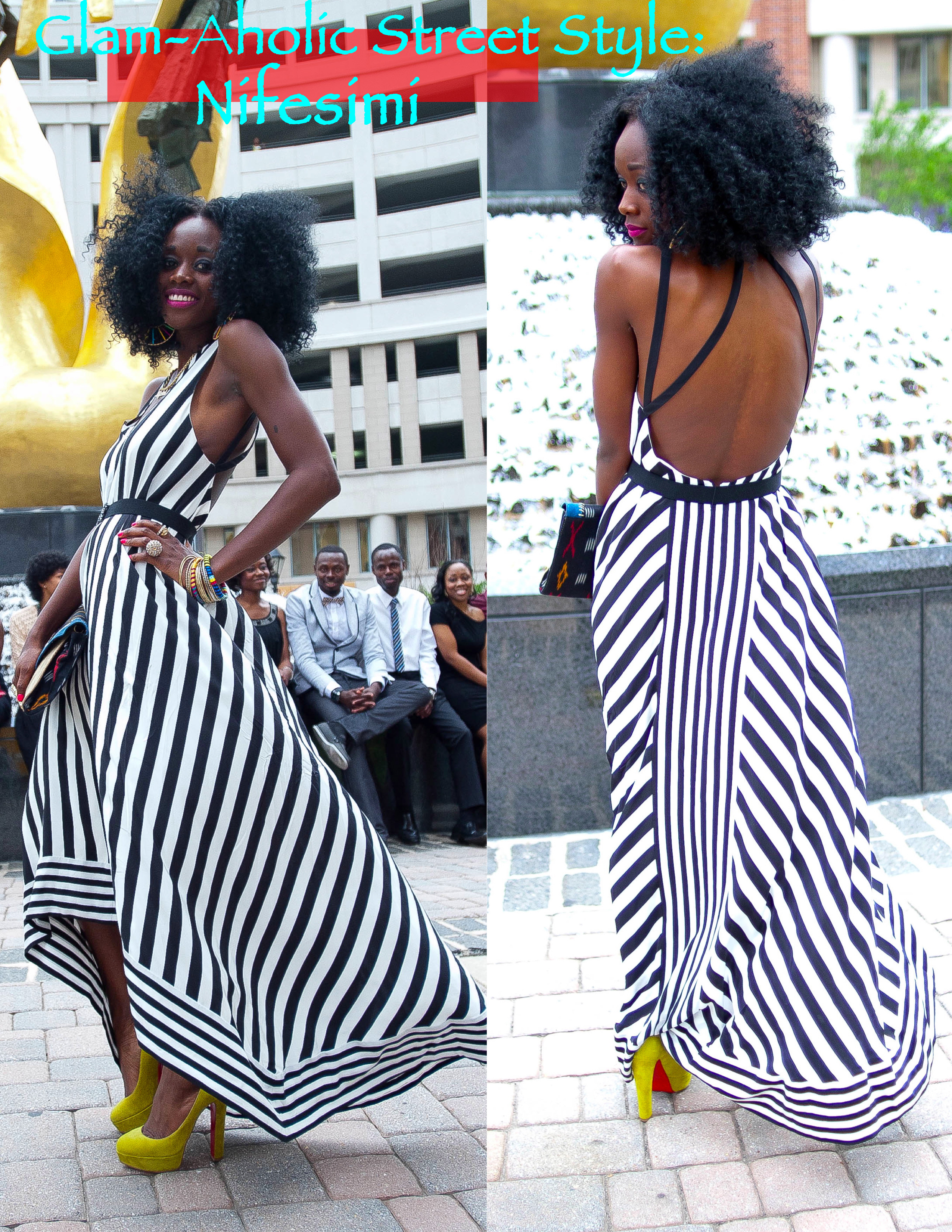 What are you wearing? I’m wearing a BCBGMAXAZRIA stripped maxi dress with my Aldo tribal purse. To add a color accent, I paired the look with my lime green Christian Louboutin Pumps.